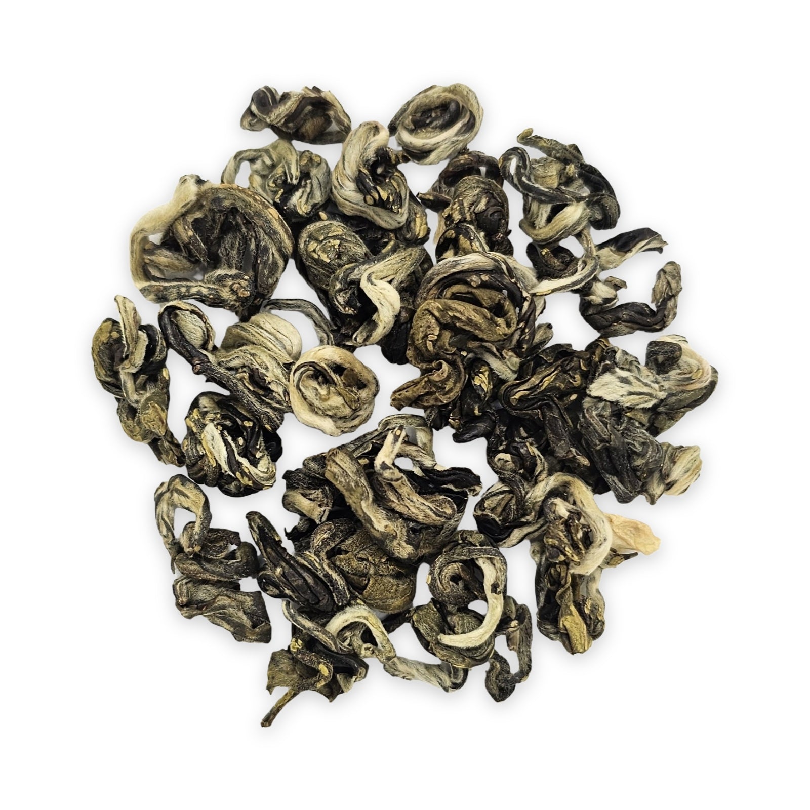 (Chine) Ce thé blanc rare est produit dans la province de Jiangsu, sur les deux montagnes du lac Taihu. Issu de la première récolte du printemps, seuls les bourgeons au duvet blanc sont cueillis et roulés à la main et séchés avec une abondance de fleurs de jasmin fraîches pour laisser leur riche parfum s'imprégner.