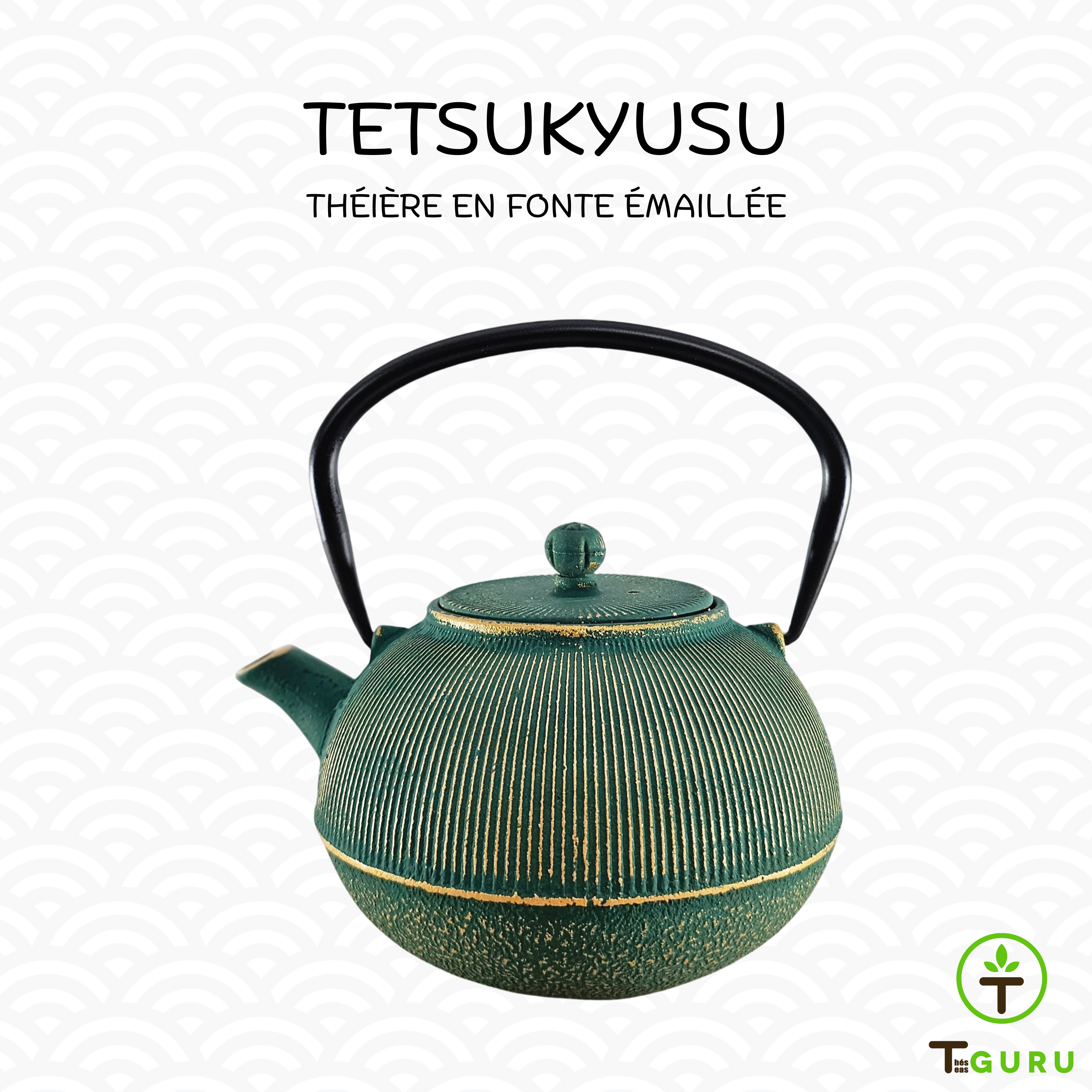 TETSUKYUSUThéière-bouilloire japonaise en fonte émaillée, avec filtre en acier inoxydable amovible.